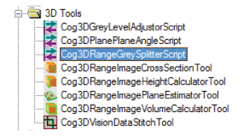 To produce both a rerendered range image and/or a rerendered greyscale image you must first use a Cog3DRangeGreySplitterScript CogToolBlock to split the image into its 3D range image and grey image components before giving it to the Cog3DVisionDataRerender tool. Locate the Cog3DRangeGreySplitterScript CogToolBlock under 3D Tools in the QuickBuild tool palette: