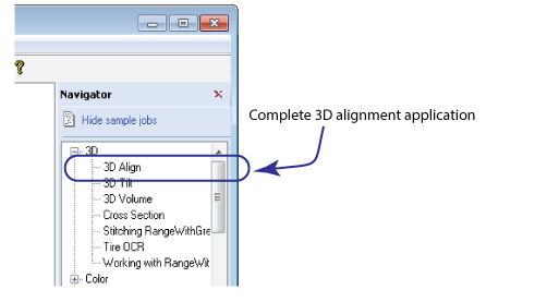 The complete application exists as a QuickBuild sample job as part of your VisionPro installation. Find the job in the Navigator pane under the 3D category: