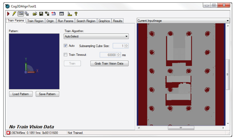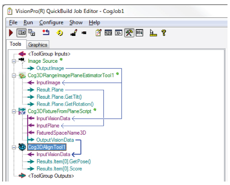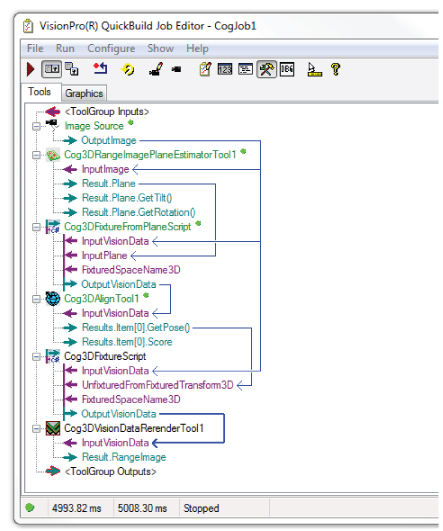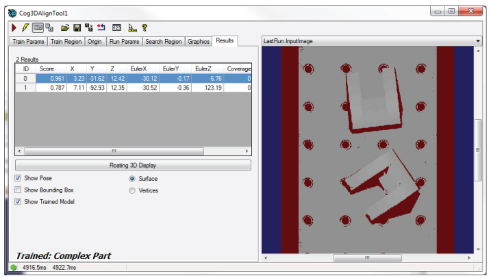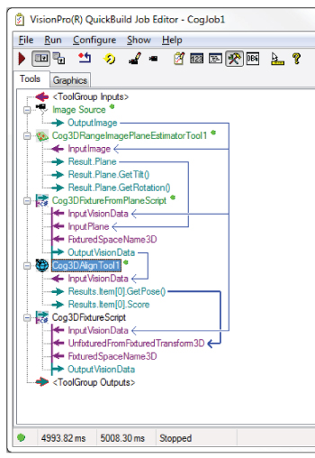 VisionPro contains a set of vision tools that can be combined to create a 3D alignment application for locating the position and orientation of 3D shapes in successive 3D range images. Once your application has a trained 3D model, one or more results can be found within a volume of space: