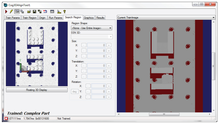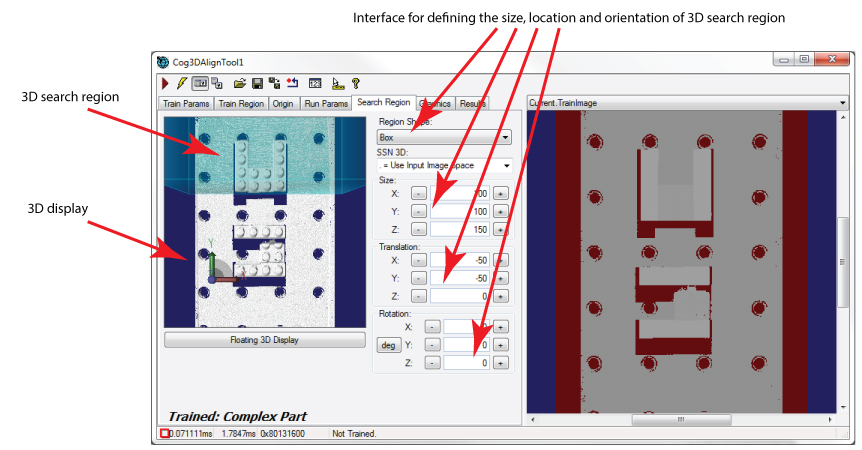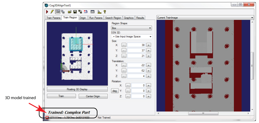 The 3D Display reflects any changes you make to the Size, Translation and Rotation parameters of the train region. The tab also contains a Floating 3D Display button to open a floating 3D display containing the 3D range image and the train region, which can make it easier to see the changes you make to the dimensions of the train region.