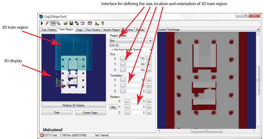 The Train Region tab contains a user interface for creating the 3D model you want to search for in successive 3D range images, including a 3D display containing the 3D range image and a 3D graphic representing the current train region:
