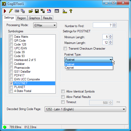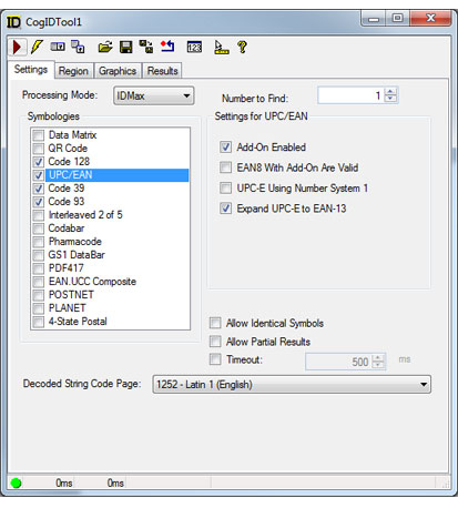 Use the Settings tab to select which symbology the tool will use to decode symbols and set other run-time parameters. The following figure shows an example Settings tab: