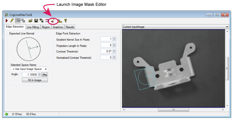 Use the Image Mask Editor to add an image mask to your input image. To access the Image Mask Editor from a CogLineMaxTool edit control, click the button highlighted in the following figure: