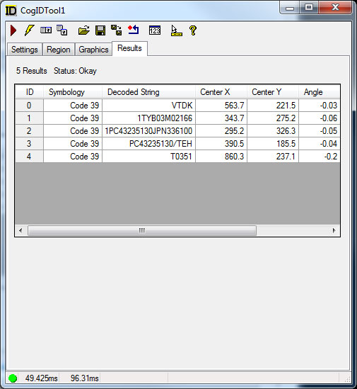 Use the Results tab to view the CogIDResults about each symbol the tool found and decoded. The following figure shows an example Results tab: