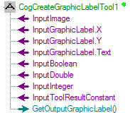 Use QuickBuild to create a CogCreateGraphicLabel tool. A new CogCreateGraphicLabel tool appears with input terminals for the InputImage and a variety of potential input values generated by other vision tools in the tool group or tool block, as shown: