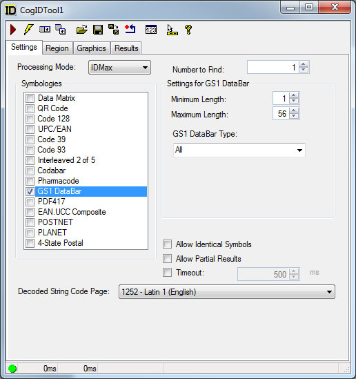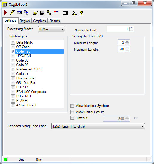 Use the Settings tab to select which symbology the tool will use to decode symbols and set other run-time parameters. The following figure shows an example Settings tab: