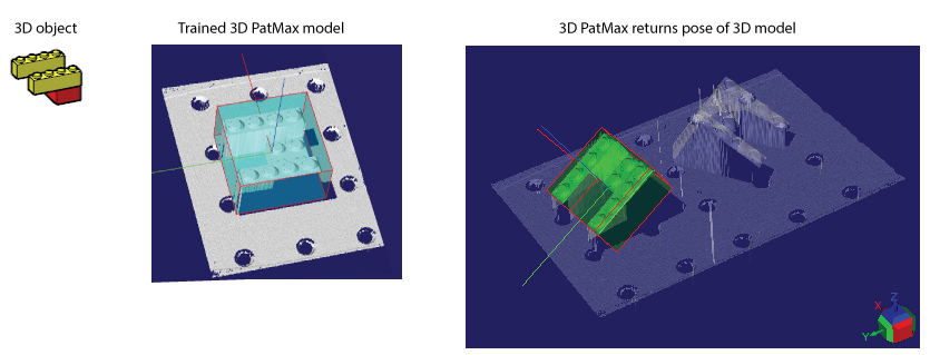 VisionPro supports the 3D PatMax tool for locating the position and orientation of 3D shapes in successive 3D range images. Once you train a 3D PatMax tool with a 3D model, it can return one or more results from a given volume of space:
