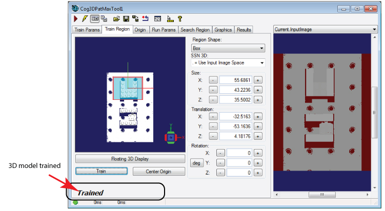 The 3D Display reflects any changes you make to the Size, Translation and Rotation parameters of the train region. The tab also contains a Floating 3D Display button to open a floating 3D display containing the 3D range image and the train region, which can make it easier to see the changes you make to the dimensions of the train region.