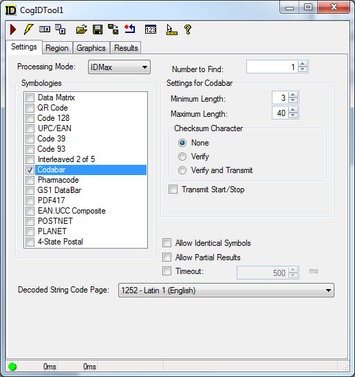 Use the Settings tab to select which symbology the tool will use to decode symbols and set other run-time parameters. The following figure shows an example Settings tab: