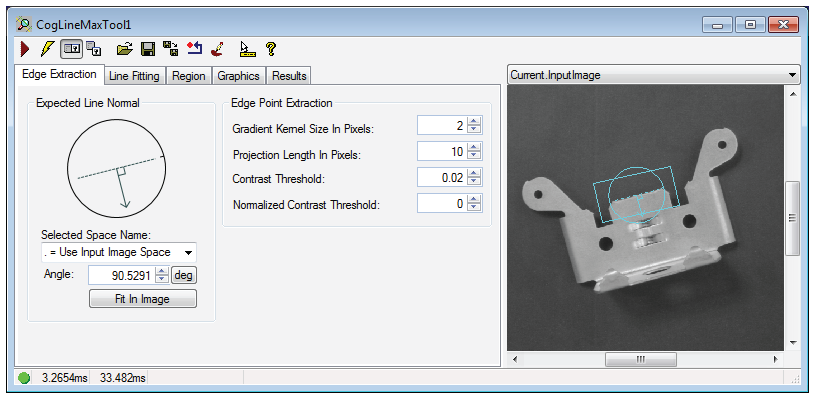 The CogLineMaxTool edit control provides a graphical user interface to the CogLineMaxTool, which you use to locate candidate edge points and fit the best possible line segment based on criteria you specify: