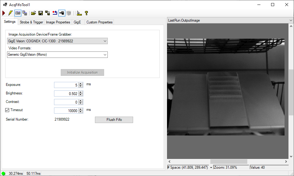 See the topic Control Reference for a description of the buttons along the top of the edit control. The AcqFifo edit control supports a LastRun.OutputImage buffer containing the last acquired image from your camera, which you can pass to other vision tools for image processing and analysis.