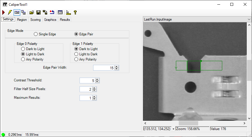 - The Current.InputImage buffer contains the current input image to the Caliper tool. When you run the tool, it examines the projection region in the InputImage and determines the number of edges or edge pairs based on the criteria defined in the Settings tab. The results of this search can be viewed on the Results tab.