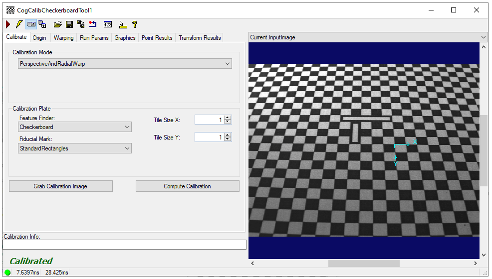 The Current.CalibrationImage buffer contains the image of the calibration pattern copied from the Current.InputImage buffer as you configure the tool, with graphics to indicate found vertices.