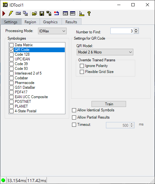 Train: Train the ID tool with 2D symbol parameters based on the current image. Training the tool can improve its performance when all the symbols the application will decode share the same characteristics.