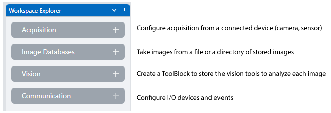 The Workspace Explorer on the left supports options for starting a new vision solution: