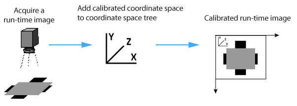 As your vision application executes, the Checkerboard Calibration tool attaches the precomputed transformation to the coordinate space tree of each run-time image. Vision tools that analyze the run-time image in the calibrated coordinate space can generate results in desired physical units relative to your application environment:
