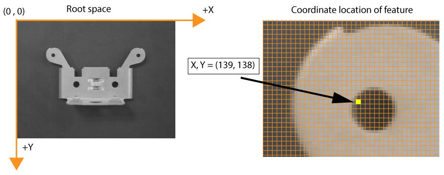 By default all VisionPro acquired images support a root space - a left-handed coordinate system aligned with the origin (0, 0) at the upper-left corner of the upper-left pixel of the image. Any vision tool can report the location of a feature with (X,Y) values from the root space coordinate system:
