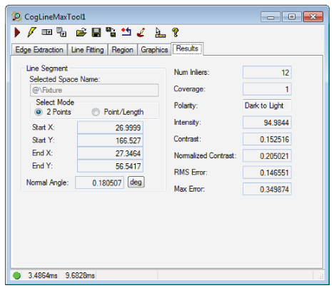 The CogLineMaxTool edit control provides a graphical user interface to the CogLineMaxTool, which you use to locate candidate edge points and fit the best possible line segment based on criteria you specify: