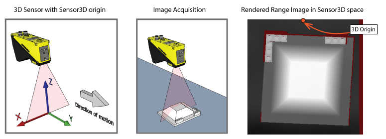 In some vision applications, you might want to generate an entirely new coordinate space and use it to rerender an existing range image before you analyze it with additional 2D and 3D vision tools. For example, your production environment might constrain how you mount the 3D sensor above the motion plane and force your application to generate range images as shown in the following figure: